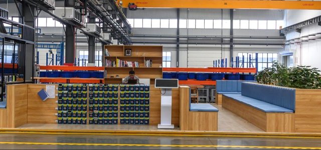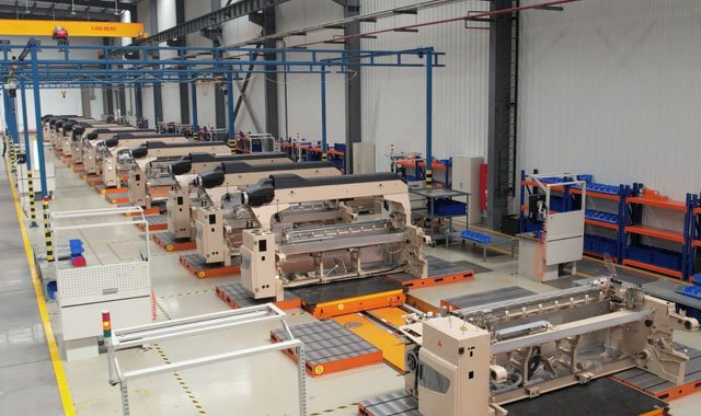 海佳現(xiàn)代化智能總裝車間是國際著名設計公司為海佳機械定制設計的全球首個織機脈動式裝配生產(chǎn)線體。整個總裝車間由平臺安裝區(qū)、脈動線組裝區(qū)、模組組裝區(qū)、試機平臺區(qū)四個部分組成。整個裝配過程的物料運轉和配送,全部由AGV和RGV系統(tǒng)自動調(diào)度,整條線體除了整機裝配外,全部實現(xiàn)自動化生產(chǎn)。目前線體承擔的是海佳噴水織機和噴氣織機的裝配,單班每天的產(chǎn)量在21-22臺。