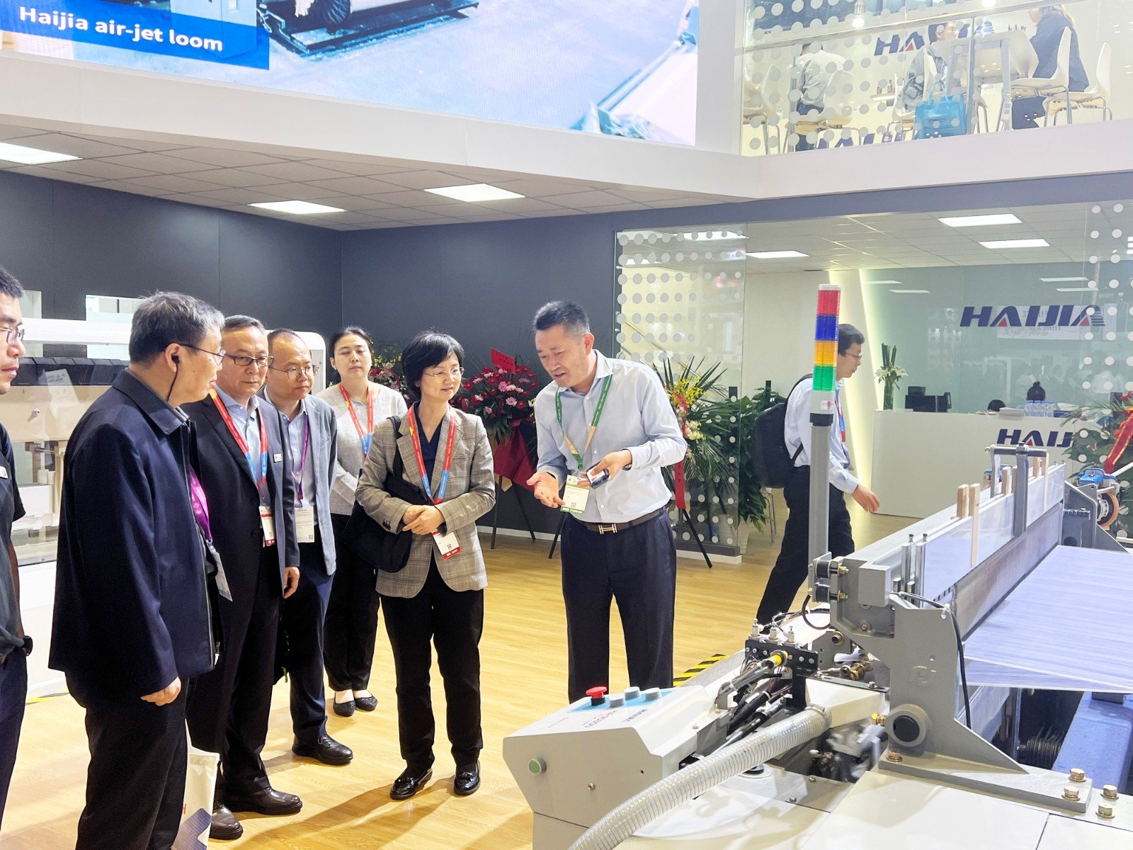 工業(yè)和信息化部消費品工業(yè)司副司長鄭艷一行領(lǐng)導(dǎo)參觀海佳展位,董事長王安儉重點介紹了海佳噴氣織機創(chuàng)新賣點。